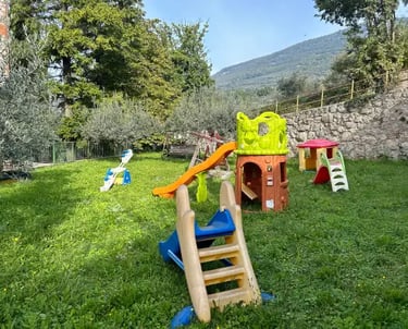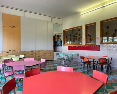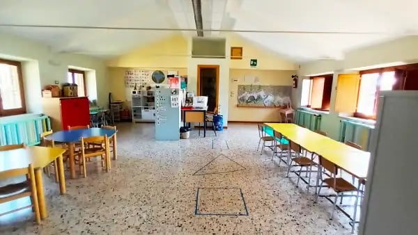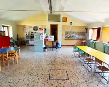 Aree verdi attrezzate e recintate (800mq), Aula Polivalente con palcoscenico e proiettore (108 mq), Aula Lim, 3 Aule luminose, Aula mensa e Zona nanna